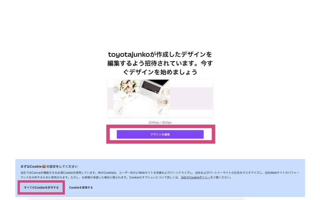 送付したCanvaの共有リンクをクリックするとCanvaのログイン画面、